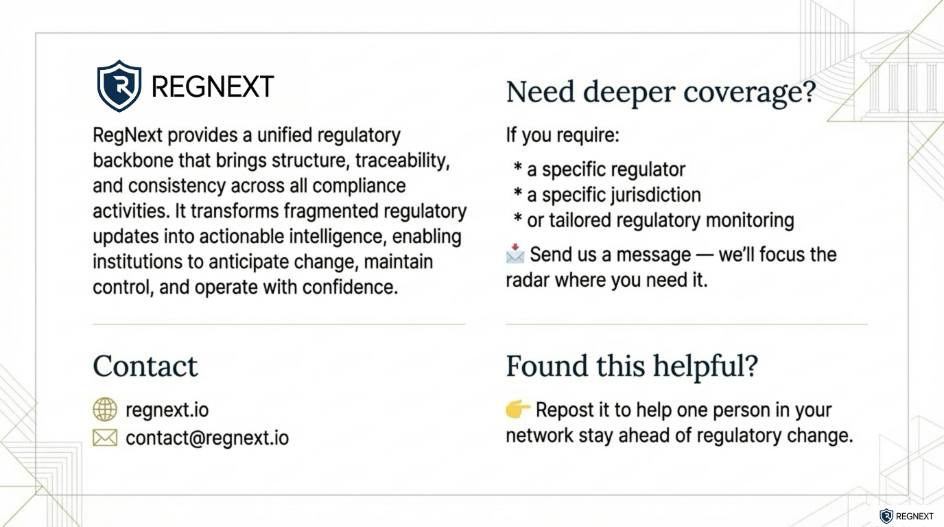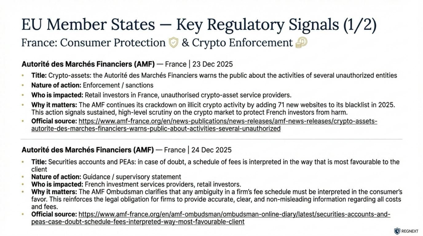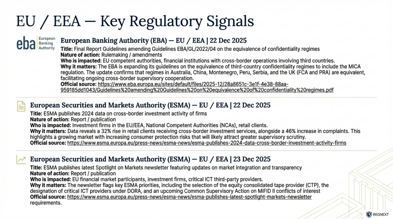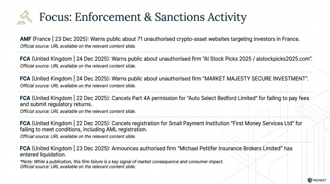 𝗪𝗲𝗲𝗸𝗹𝘆 𝗚𝗹𝗼𝗯𝗮𝗹 𝗥𝗲𝗴𝘂𝗹𝗮𝘁𝗼𝗿𝘆 𝗜𝗻𝘁𝗲𝗹𝗹𝗶𝗴𝗲𝗻𝗰𝗲 𝗕𝗿𝗶𝗲𝗳𝗶𝗻𝗴 | 𝗘𝘂𝗿𝗼𝗽𝗲 (𝗘𝗘𝗔 + 𝗨𝗞) 𝗪𝗲𝗲𝗸 𝗼𝗳 22–26 𝗗𝗲𝗰 𝟮𝟬𝟮𝟱 Europe closed the year with clear enforcement signals and zero ambiguity on expectations.Across the UK and the EU, regulators reinforced a simple message: basic compliance failures, consumer harm, and unauthorised activity will not be tolerated — regardless of firm size or sector.Three takeaways stood out ⬇️⚖️ Enforcement is operational, not theoretical In the UK, the FCA intensified actions against unauthorised firms, cancelled permissions, and publicly named firms entering liquidation. Failure to meet baseline obligations now translates directly into market exit.🛡️ Consumer protection is the anchor From France’s crypto-asset blacklists to FCA public warnings, regulators are actively removing harmful actors and tightening disclosure expectations. Protection of retail investors remains the dominant supervisory lens.🌍 EU frameworks are tightening and aligning At EU level, supervisors are clarifying cross-border supervision, MiCA implementation, and market transparency. The direction is not easing — it is consolidation, standardisation, and stronger coordination.💬 Need deeper coverage? If you want monitoring for a specific European regulator, country, or theme (crypto, enforcement, resilience, reporting), send us a message — we’ll focus the radar where it matters.🔁 Found this useful? Repost to help someone in your network stay ahead of regulatory change.hashtag#Regulationhashtag#Compliancehashtag#Riskhashtag#RegTechhashtag#FinancialServiceshashtag#Europehashtag#UKhashtag#Enforcementhashtag#ConsumerProtectionhashtag#RegulatoryChangehashtag#RegNexthashtag#AgenticAI
