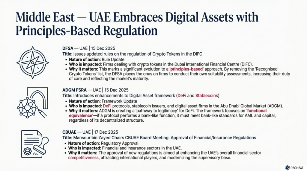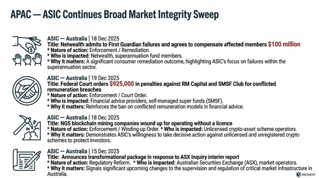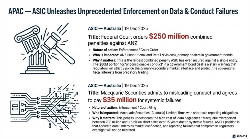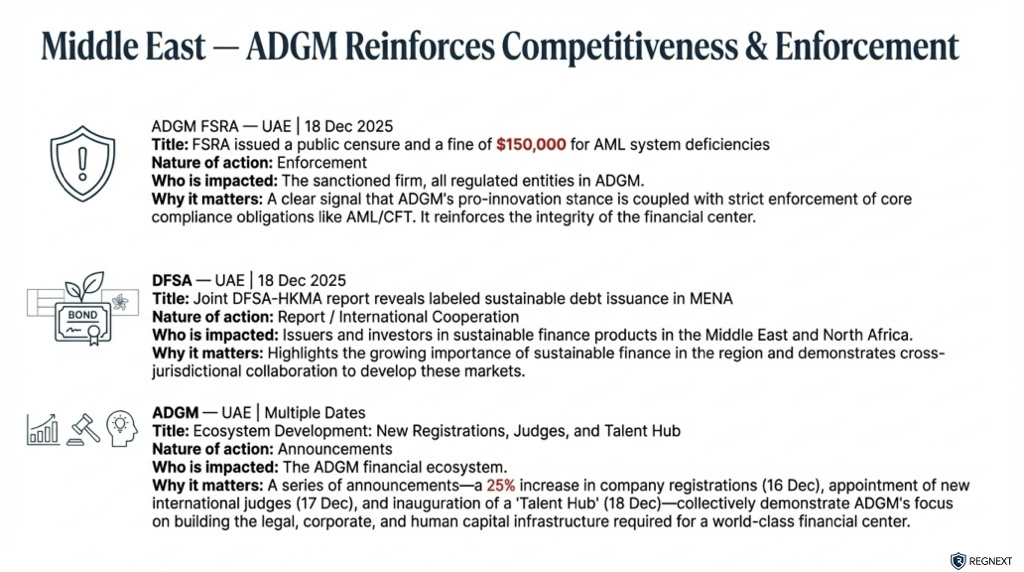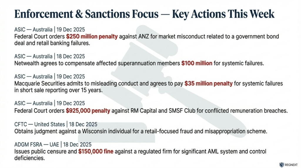 Regulators closed the year decisively. Across the US, Europe, APAC and the Middle East, supervision and enforcement accelerated — with clear signals for 2026.Three takeaways stood out ⬇️🔍 Supervision is becoming explicit The US Federal Reserve and the SEC moved to formalise expectations. Less interpretation. More accountability.⚖️ Enforcement is escalating In Australia, ASIC secured a court-ordered AUD 250m penalty against ANZ — one of its largest ever. Enforcement is no longer episodic. It’s structural.🌐 Global alignment, local divergence From ESMA and the FCA to MAS, HKMA and ADGM, regulators are tightening rules across markets, crypto and payments — but not in the same way.📎 Full Global Regulatory Radar attached Named regulators. Clear dates. Official sources. No noise.💬 Need coverage of a specific regulator or jurisdiction? Send us a message — we’ll focus the radar where it matters.🔁 Found this helpful? Repost it to help someone in your network stay ahead.hashtag#Regulationhashtag#Compliancehashtag#Riskhashtag#RegTechhashtag#FinancialServiceshashtag#Enforcementhashtag#Supervisionhashtag#RegulatoryChange #RegNext#𝗔𝗴𝗲𝗻𝘁𝗶𝗰𝗔𝗜
