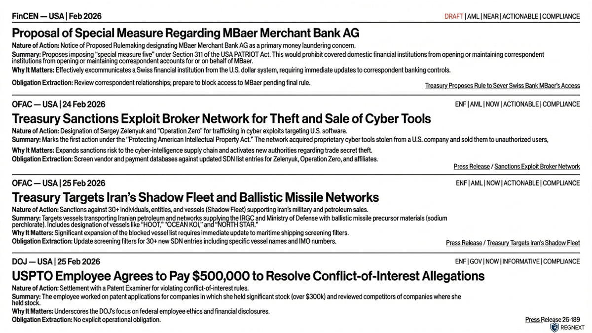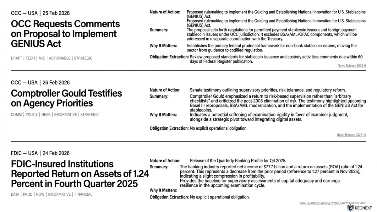North American regulators accelerated sharply in late February โ with digital asset codification, AI accountability, and sanctions architecture all intensifying at once.