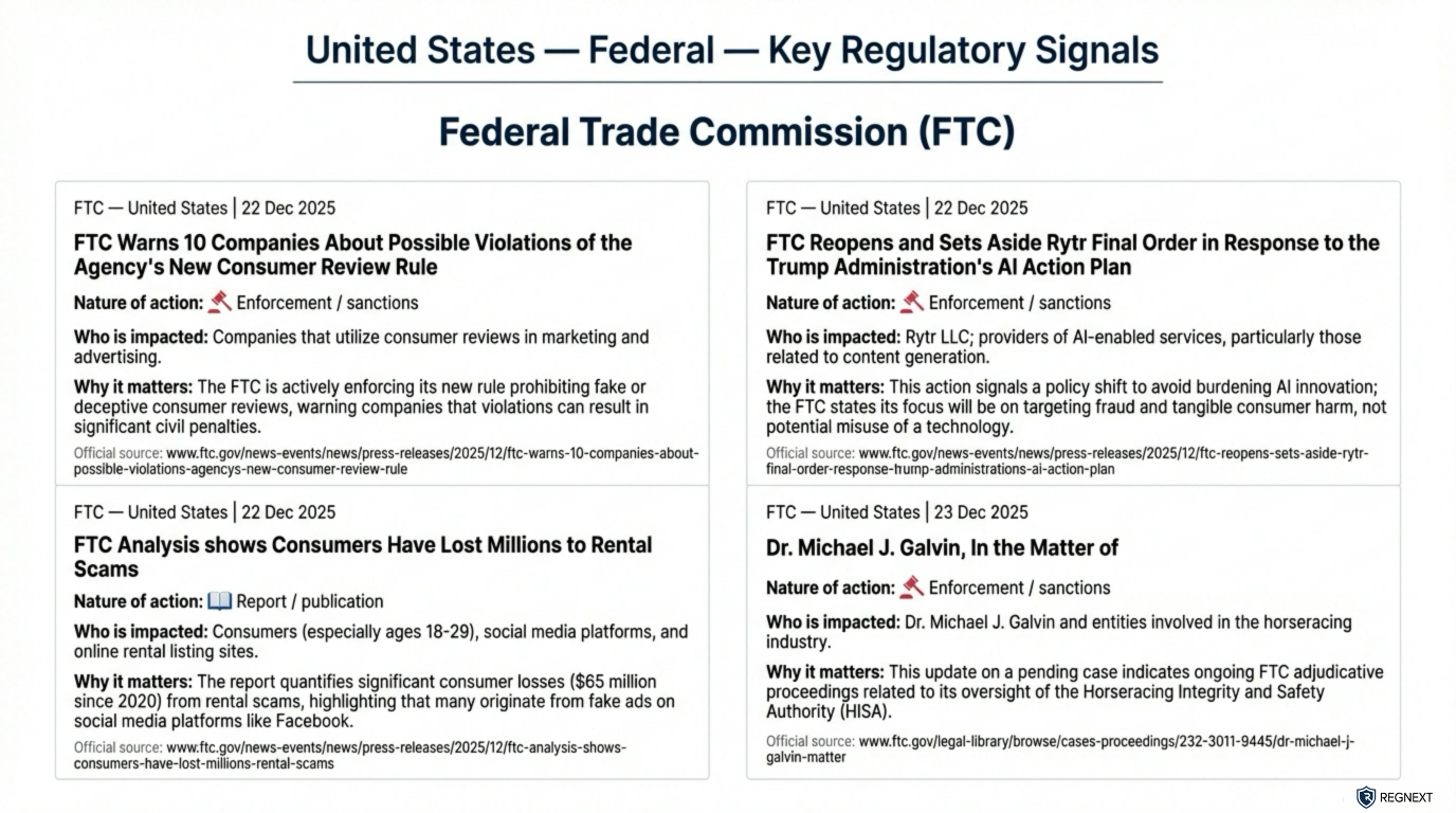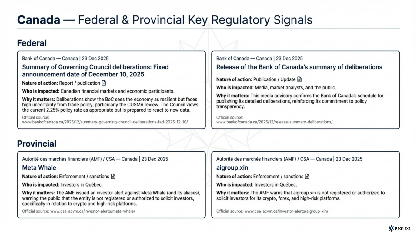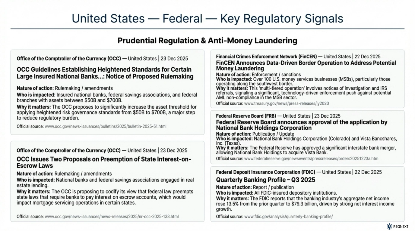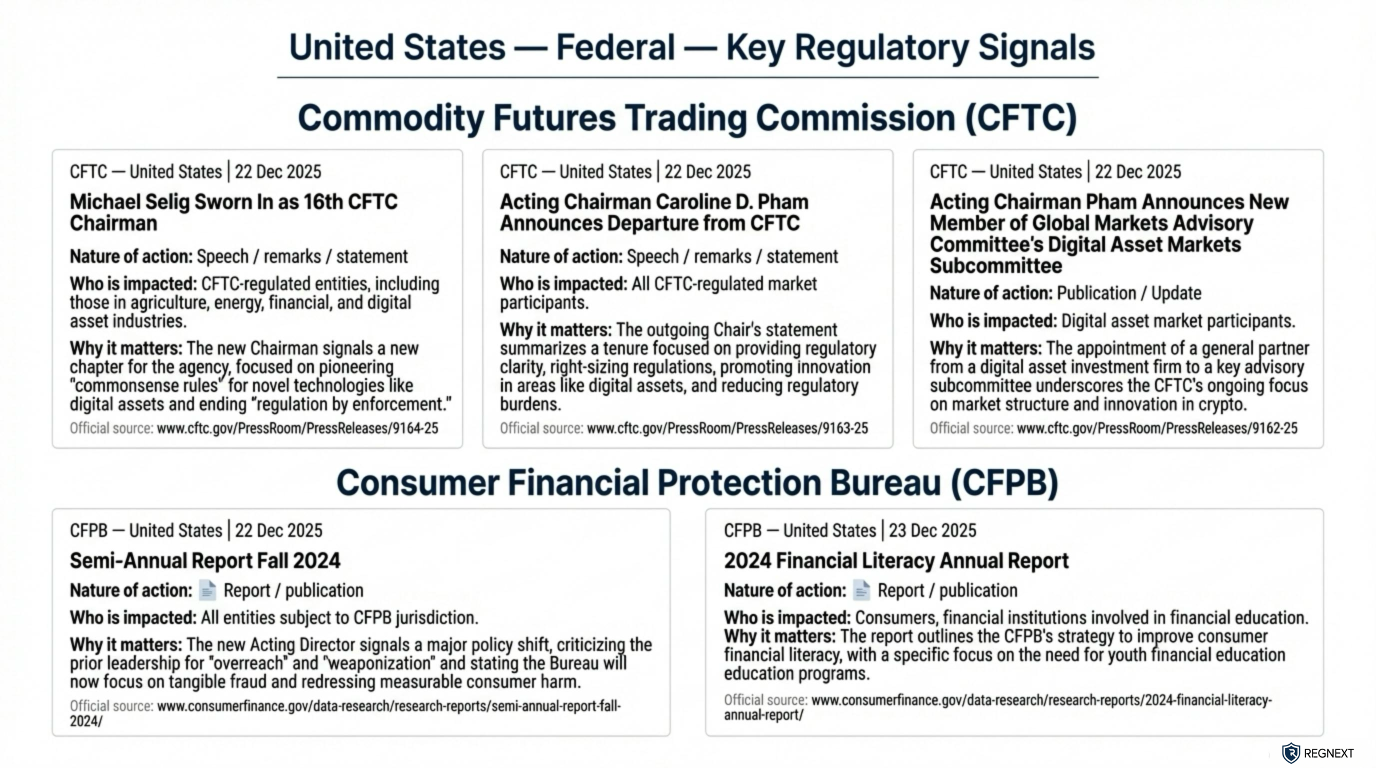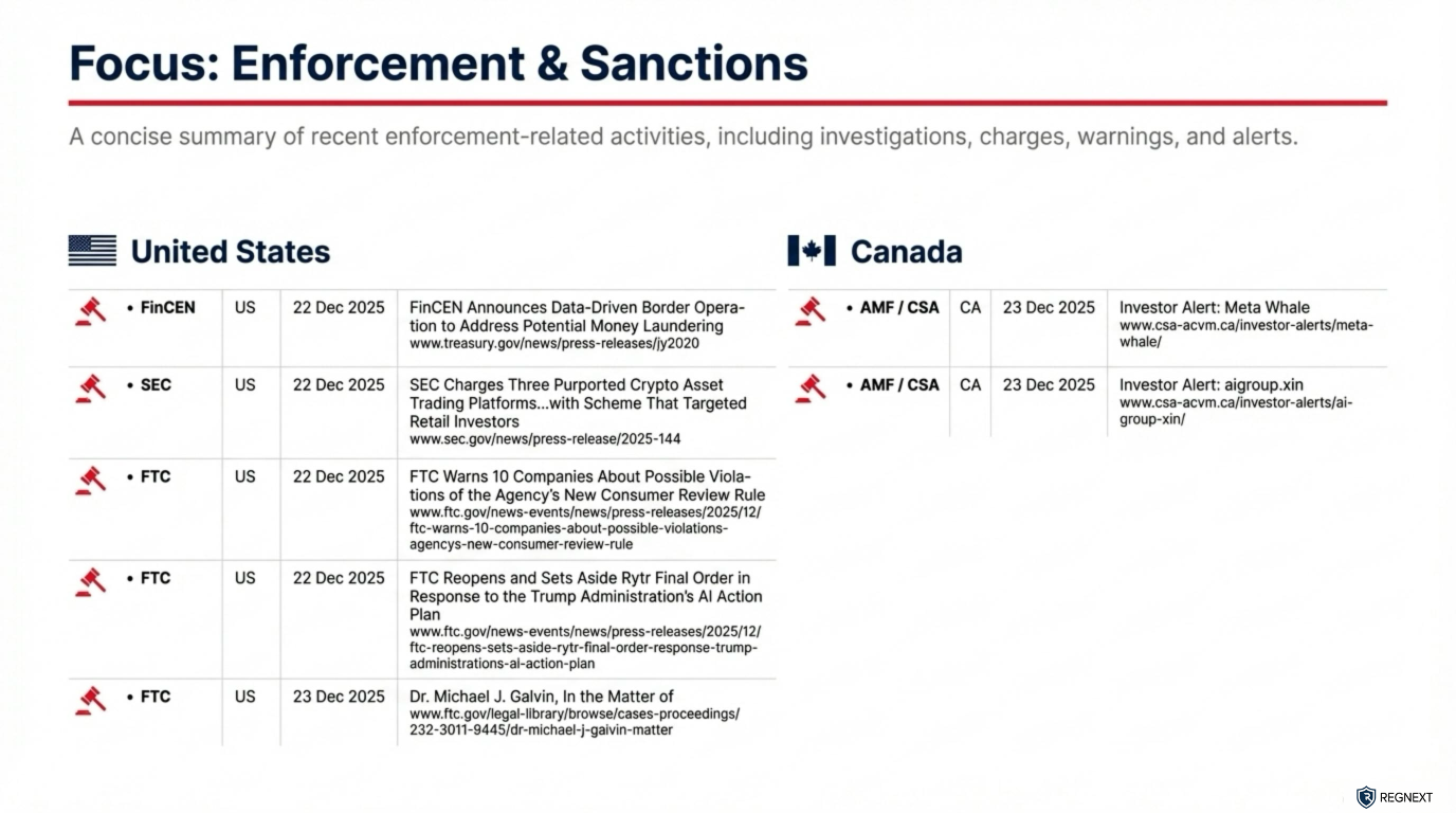 𝗪𝗲𝗲𝗸𝗹𝘆 𝗚𝗹𝗼𝗯𝗮𝗹 𝗥𝗲𝗴𝘂𝗹𝗮𝘁𝗼𝗿𝘆 𝗜𝗻𝘁𝗲𝗹𝗹𝗶𝗴𝗲𝗻𝗰𝗲 𝗕𝗿𝗶𝗲𝗳𝗶𝗻𝗴 | 𝗡𝗼𝗿𝘁𝗵 𝗔𝗺𝗲𝗿𝗶𝗰𝗮 (𝗨𝗦 + 𝗖𝗮𝗻𝗮𝗱𝗮) 𝗪𝗲𝗲𝗸 𝗼𝗳 22–26 𝗗𝗲𝗰 𝟮𝟬𝟮𝟱North American regulators ended the year with a clear recalibration of priorities — combining strong enforcement in high-risk areas with selective relief where rules were no longer proportionate.The message is nuanced, but consistent: protect consumers, target real harm, and remove unnecessary friction.Three takeaways stood out ⬇️⚖️ Enforcement is becoming more targeted US agencies continued to pursue fraud, crypto-related misconduct, AML breaches, and deceptive practices — while explicitly signalling a move away from blanket “regulation by enforcement” toward measurable consumer harm and accountability.🔄 Frameworks are being recalibrated, not loosened From Treasury clearing implementation to OCC proposals raising prudential thresholds, regulators are adjusting frameworks to reflect operational reality — reducing burden for some institutions while preserving systemic safeguards.🧭 Policy direction is clarifying for 2026 Leadership changes at key agencies and upcoming consultation deadlines signal a shift toward clearer rules, defined supervisory expectations, and earlier engagement — particularly in digital assets, AI, and market infrastructure.💬 Need deeper coverage? If you want monitoring for a specific US or Canadian regulator, sector, or theme (crypto, AML, consumer protection, market structure), send us a message — we’ll focus the radar where it matters.🔁 Found this useful? Repost to help someone in your network stay ahead of regulatory change.hashtag#Regulationhashtag#Compliancehashtag#Riskhashtag#RegTechhashtag#FinancialServiceshashtag#NorthAmericahashtag#UnitedStateshashtag#Canadahashtag#Enforcementhashtag#AMLhashtag#Cryptohashtag#RegulatoryChangehashtag#RegNexthashtag#AgenticAI