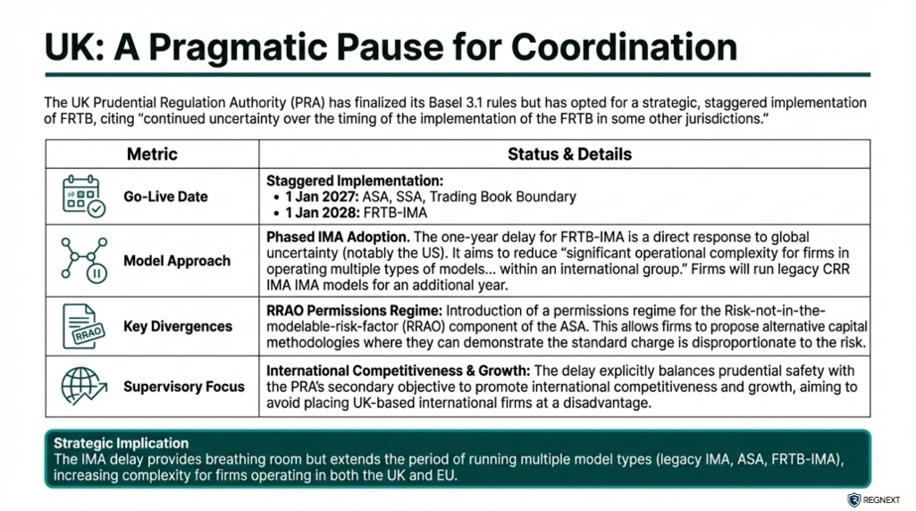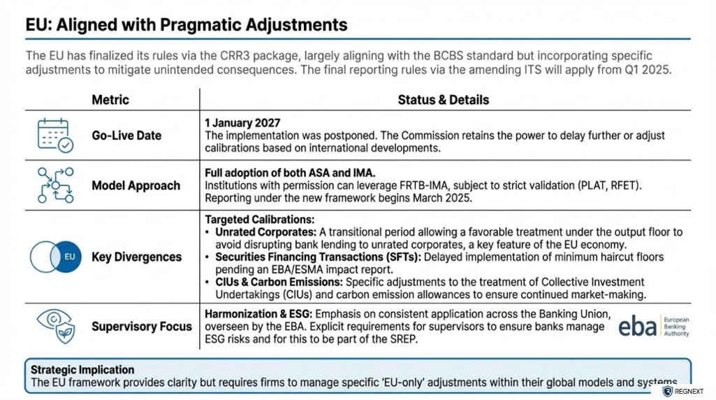 2. Strategic Delays in Europe (EU & UK)Both the EU and UK have effectively decoupled their timelines from the original Basel schedule to wait for the U.S. The EU's delay to 2027 is a direct response to the U.S. delays, ensuring EU banks are not subject to higher capital requirements for trading activities before their American competitors.