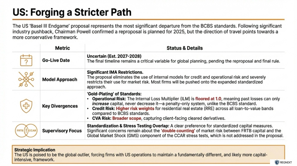 1. The U.S. "Gold-Plating" and ReproposalThe U.S. divergence has deepened. The original 2023 proposal was criticized for "gold-plating" (exceeding) international standards, such as prohibiting internal models for credit risk and imposing higher risk weights on residential mortgages (up to 20 percentage points higher than Basel III),. With the confirmed reproposal of these rules, the U.S. is currently the furthest behind in the implementation cycle.