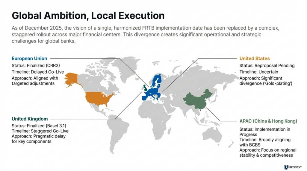 The implementation of the Fundamental Review of the Trading Book (FRTB) has shifted from a coordinated global rollout to a fragmented timeline. While Hong Kong has proceeded with a 1 January 2025 implementation, Western jurisdictions have significantly delayed enforcement to protect domestic banking competitiveness.