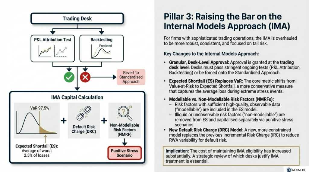 - The Internal Models Approach (IMA): The FRTB-IMA replaces Value-at-Risk (VaR) with Expected Shortfall (ES) to better capture tail risk and market illiquidity. Crucially, model approval is now required at the trading desk level, allowing supervisors to withdraw approval for specific desks without invalidating the entire model. Existing IMA permissions will generally not be saved; firms must apply for new permissions under the FRTB-IMA rules.