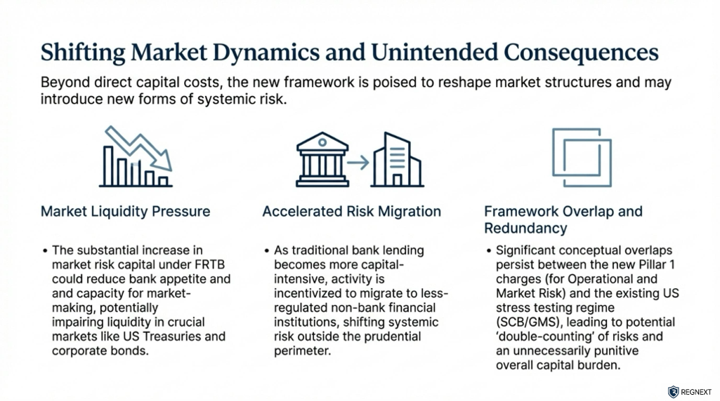 Critics argue that the FRTB overlaps with the Global Market Shock (GMS) component of US supervisory stress tests, effectively double-counting market risk. Furthermore, there are concerns that increased capital costs will reduce market liquidity, increase hedging costs for end-users (such as farmers and pension funds), and accelerate the migration of activity to the non-bank financial sector.